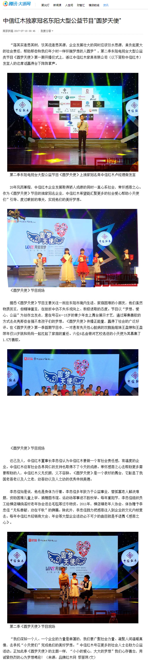 腾讯网:为梦想喝彩,中信红木独家冠名东阳大型公益节目《圆梦天使》