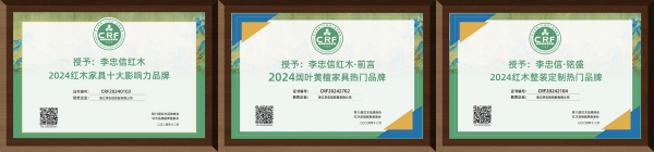 李忠信红木蝉联“红木家具十大影响力品牌”、“阔叶黄檀家具热门品牌”、“全屋定制热门品牌”