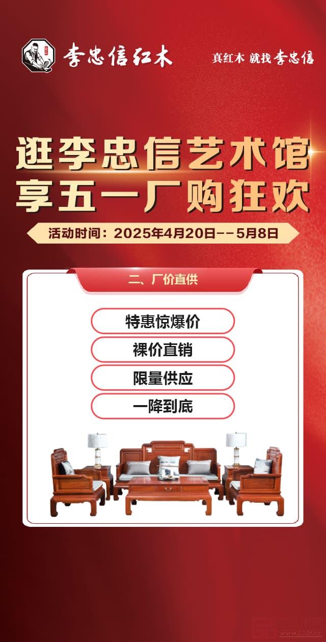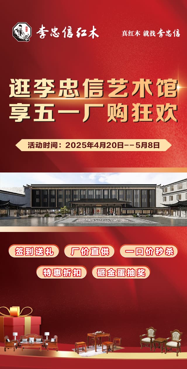 在这个五一,李忠信红木为您带来一场真正的“厂价直供”盛宴。精选优质红木产品,以惊爆低价直接销售,限量供应,一降到底。没有中间商赚差价,没有复杂的折扣套路,只有最实惠的价格和最真诚的承诺。在这里,您可以以最实惠的价格,购得心仪的红木家具,真正实现“工厂到家”的一站式购物体验。