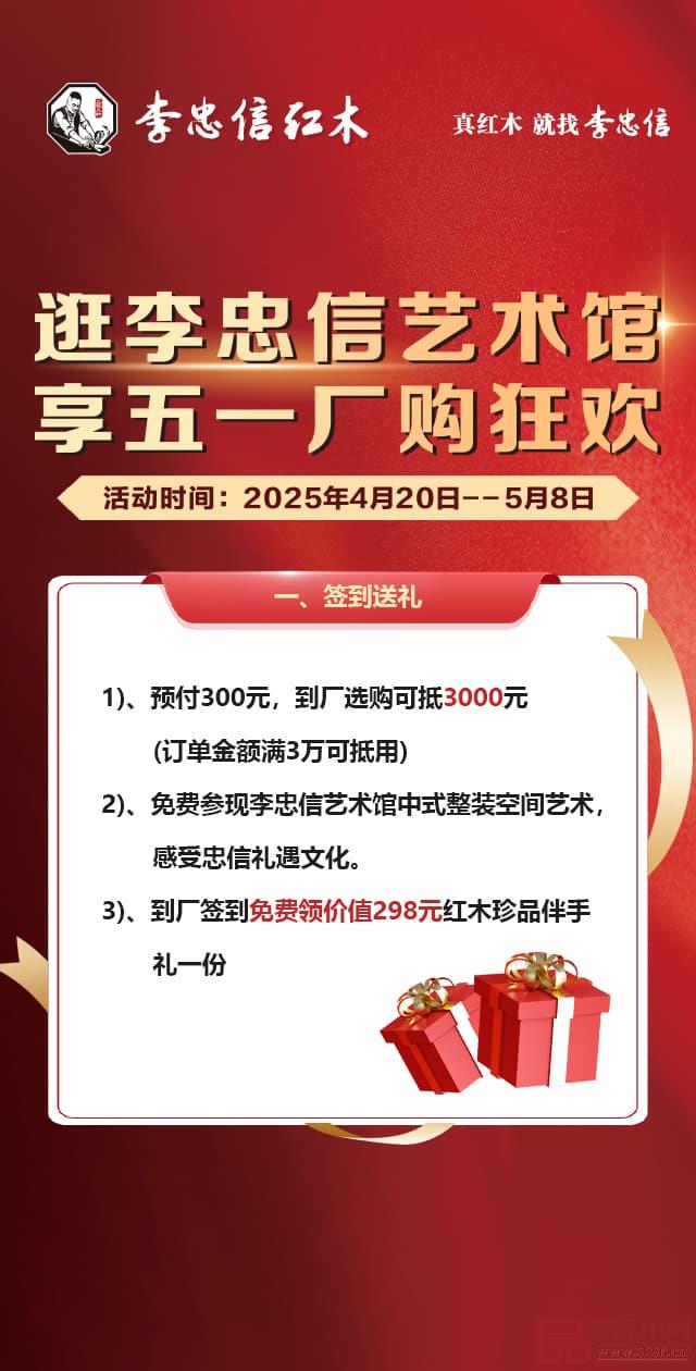 预付300元诚意金,即可到厂选购,抵扣3000元(订单金额满3万可抵用)。这是一份诚意满满的惊喜,让您轻松享受超值优惠。同时,您还能免费参与李忠信艺术馆的中式整装空间艺术展示,沉浸式感受忠信礼遇文化的独特魅力。当您踏入艺术馆的那一刻,仿佛穿越时空,回到那个风雅的中式时代。而到厂签到,更有价值298元的红木珍品伴手礼免费领取,精美礼品,心意满满,为您的购物之旅增添一份特别的纪念。
