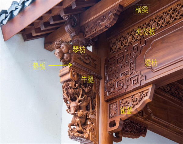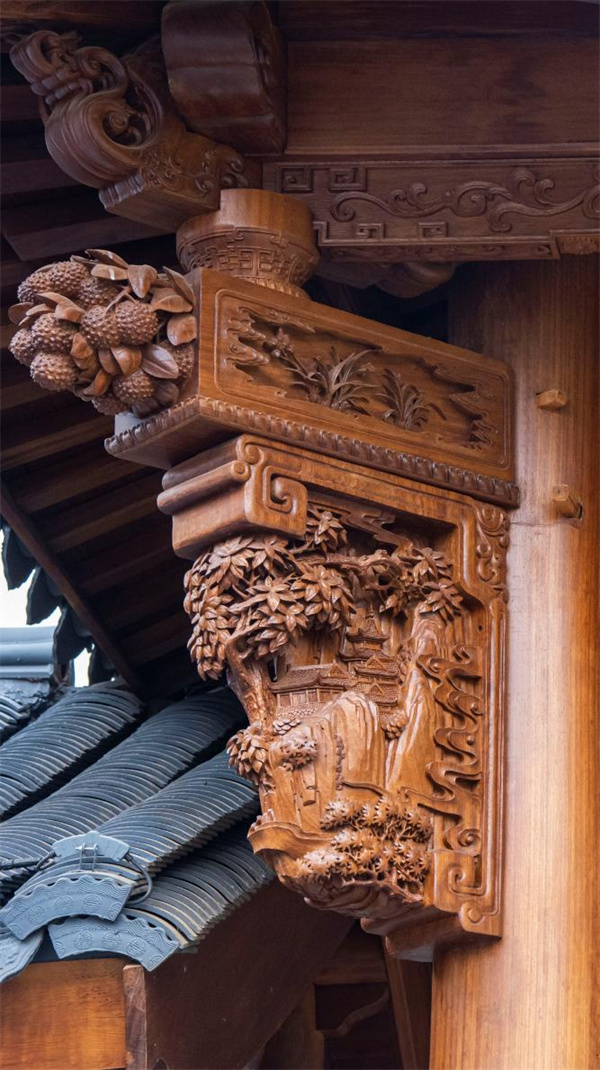 牛腿,作为古建筑中檐柱与梁枋之间的重要构件,在建筑中发挥着承重与装饰的双重作用 。其形状上大下小,犹如牛腿,故而得名 。李忠信艺术馆的牛腿雕花工艺精湛,展现出了古代工匠们的高超技艺和独特匠心 。