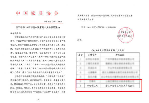 作为东阳市红木家具龙头企业,李忠信红木斩获“2025年度中国传统家具十大品牌”,行业标杆地位再获权威认证。此次获评,是继"中国红木家具十大影响力品牌"后获得的又一国家级权威认可。