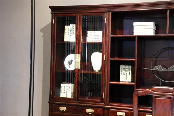 《景程书柜》体态方正,仿佛一位温文尔雅的君子,静静地伫立在书房一隅。它充分考虑了实用功能的需求,采用了收纳柜格、抽屉和开放层相结合的设计,不仅能够满足收纳图书、文具等物品的需求,还能够展示一些珍藏的艺术品或装饰品。