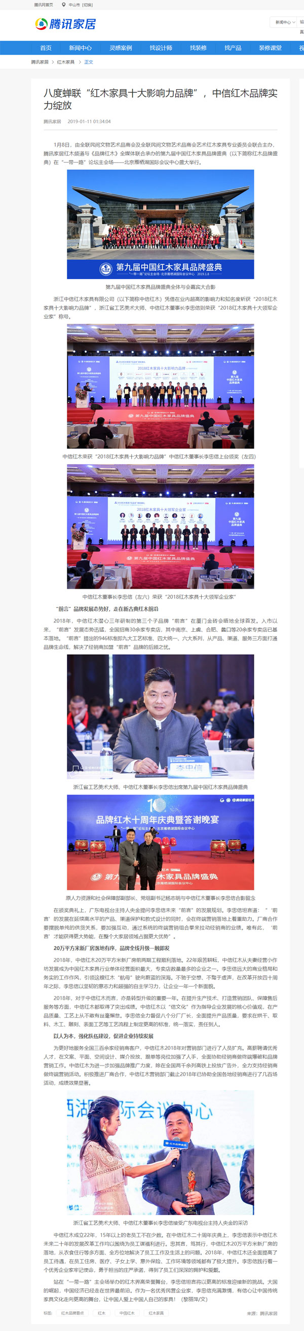 腾讯网:八度蝉联“红木家具十大影响力品牌”,中信红木品牌实力绽放
