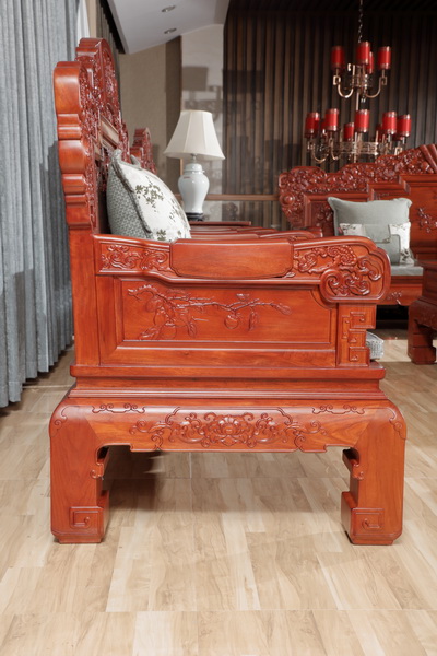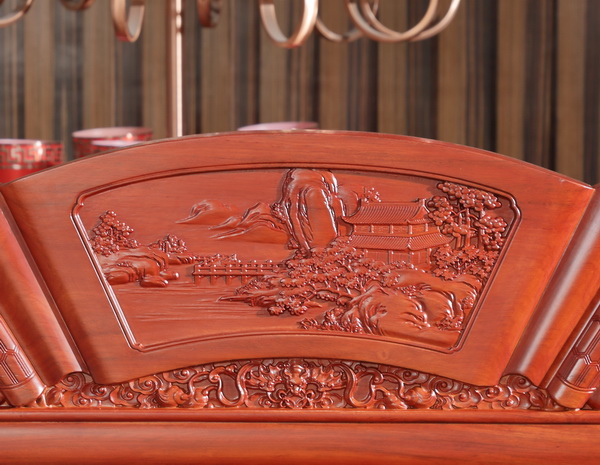 单人位尺寸为长1.17米、宽0.82米、高1.25米,比例协调,坐感舒适。深雕工艺的运用使得图案更加立体生动,尤其是在光线照射下,凹凸之间尽显光影之美。