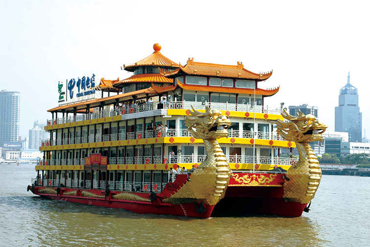 古色古香的建筑外形,全船上层建筑采用中国传统的亭台楼阁造型,全船装饰上采用朱红廊柱、雕栏画栋、木雕格门窗,船侧饰金色双龙,金龙鳞片以薄铜片制成,在阳光下熠熠生辉,夜幕中以彩灯点缀,活灵活现。